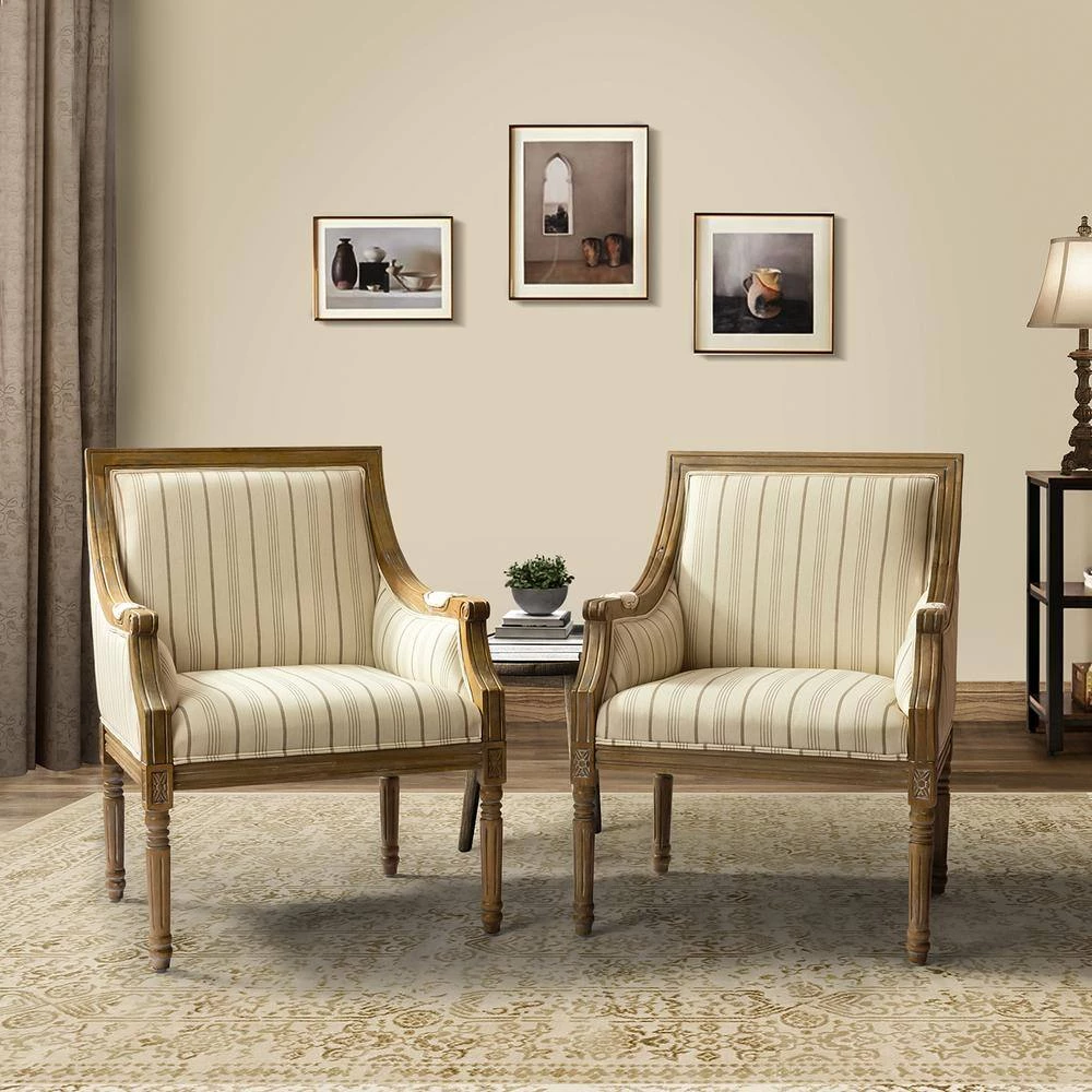 The perfect piece to reflect your novel tastes, this farmhouse armchair.anchors your seating ensemble in timeless appeal. Providing you a rich choice in terms of pattern, this piece is wrapped with polyester blend fabric for a hint of textural appeal and features both stripe and vivid floral patterns in different specific chair.. Built with the clean lines of contemporary aesthetics, it features exceptional, long-lasting details like painstakingly designed carved legs and subtly curved arms for a tailored finish. Thanks to its solid wood frame that stands up to high-traffic use, comfortable foam filling for an unforgettable seating amenity, this statement making piece is perfect for the living room. bedroom. and other scenes.