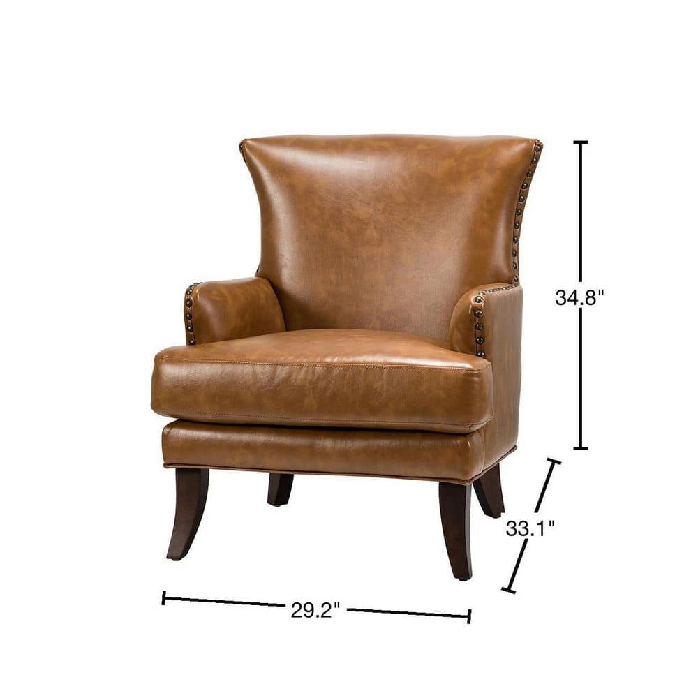 Turn a prepared corner into a sophisticated space to provide instant rest for you, a stylish accent armchair is rich in characters and functions to complete your home ensembles. Take this for example, subtly curved solid wood legs support upper soft foam-filled solid and manufactured wooden frame, boasting a perfect combination of extra sturdiness and comfort while bringing you a feel of reliable and high-grade. Wrapped in luxurious faux leather upholstery, comfortable for skin touch, its understated retro nailhead trim highlights the shape of the backrest and arms, adding a dash of distinction to your style. Thick seat cushion, harmonious curves make it a modern focal point everywhere. It’s the perfect pick for the living room, office room and bedroom.