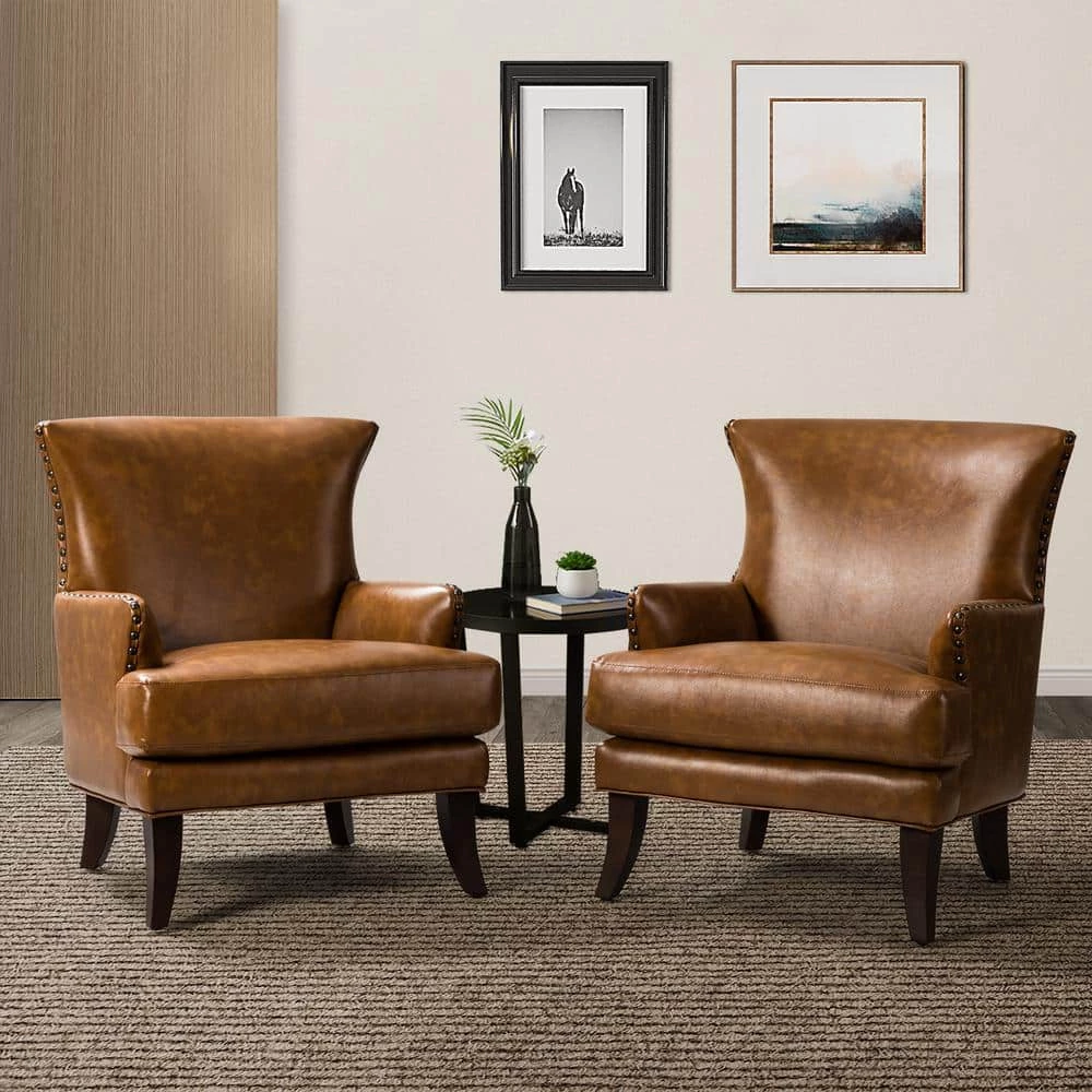 Turn a prepared corner into a sophisticated space to provide instant rest for you, a stylish accent armchair set is rich in characters and functions to complete your home ensembles. Take these for example, subtly curved solid wood legs support upper soft foam-filled solid and manufactured wooden frame, boasting a perfect combination of extra sturdiness and comfort while bringing you a feel of reliable and high-grade. Wrapped in luxurious faux leather upholstery, comfortable for skin touch, its understated retro nailhead trim highlights the shape of the backrest and arms, adding a dash of distinction to your style. Thick seat cushion, harmonious curves make this wonderful set a modern focal point everywhere. It’s the perfect pick for the living room, office room and bedroom.