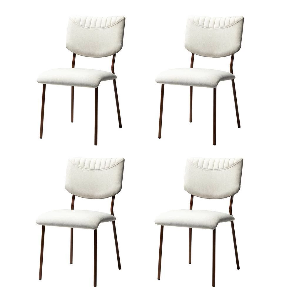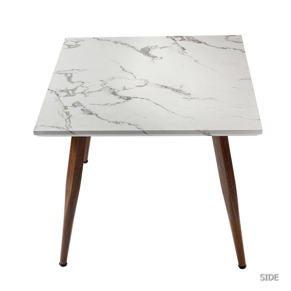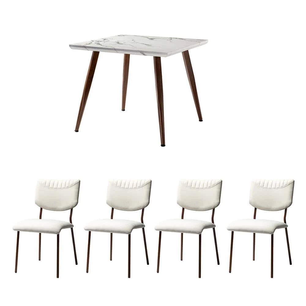 The best gatherings are held in warm and welcoming settings, and this dining set will be at the heart of it all. Anchor your dining room in trendy, mod style with this five-piece dining room set, including a table and four chairs. The square table with marble pattern features a MDF top and tapered legs for a contemporary-inspired silhouette. Set on splayed metal legs, the four dining chairs display a modern take on the simple design. The large-area hollowed out part of the chair back and waterfall seat front make it unique in vision. The armless seats are wrapped in fabric, while high-density foam filling with manufactured wood frame provides comfort and support. This eye-catching table set comfortably seats four, you can host a dinner party for friends or cook a meal for the family using this reliable and sturdy table set.