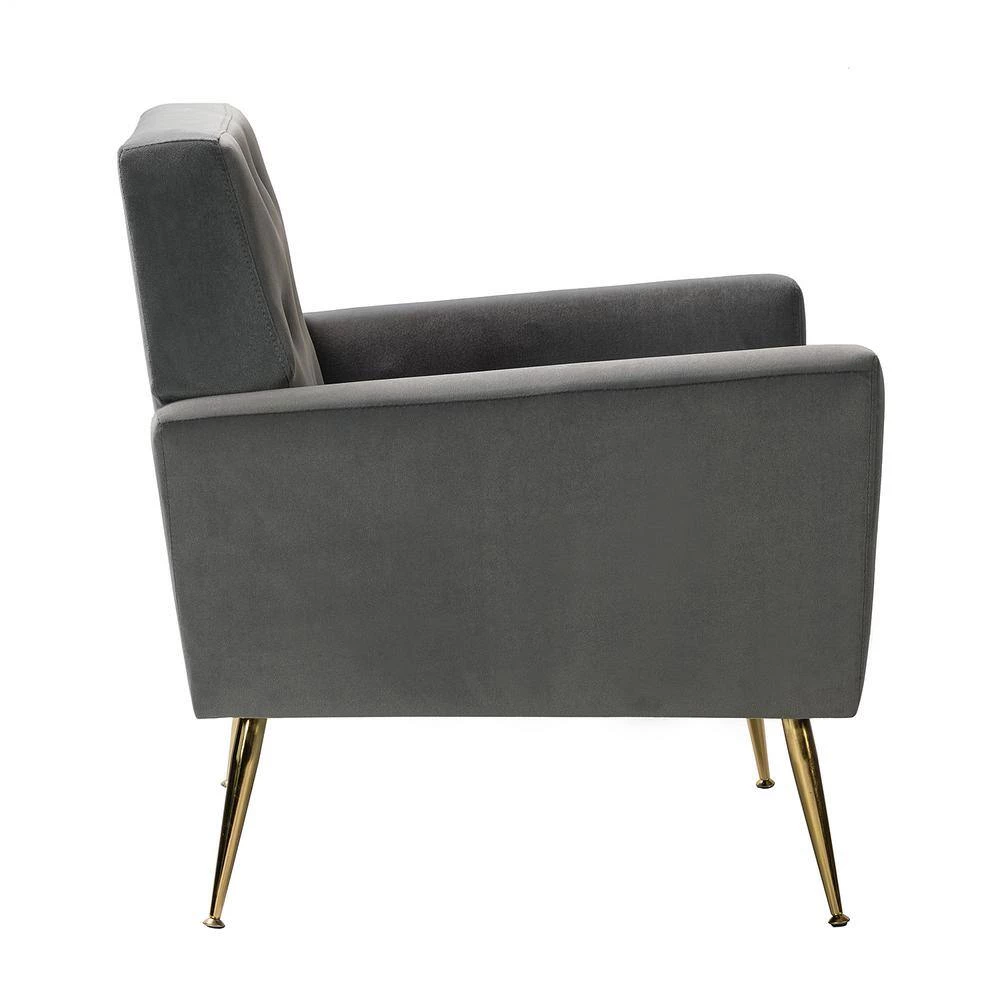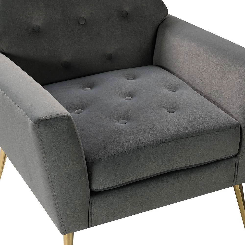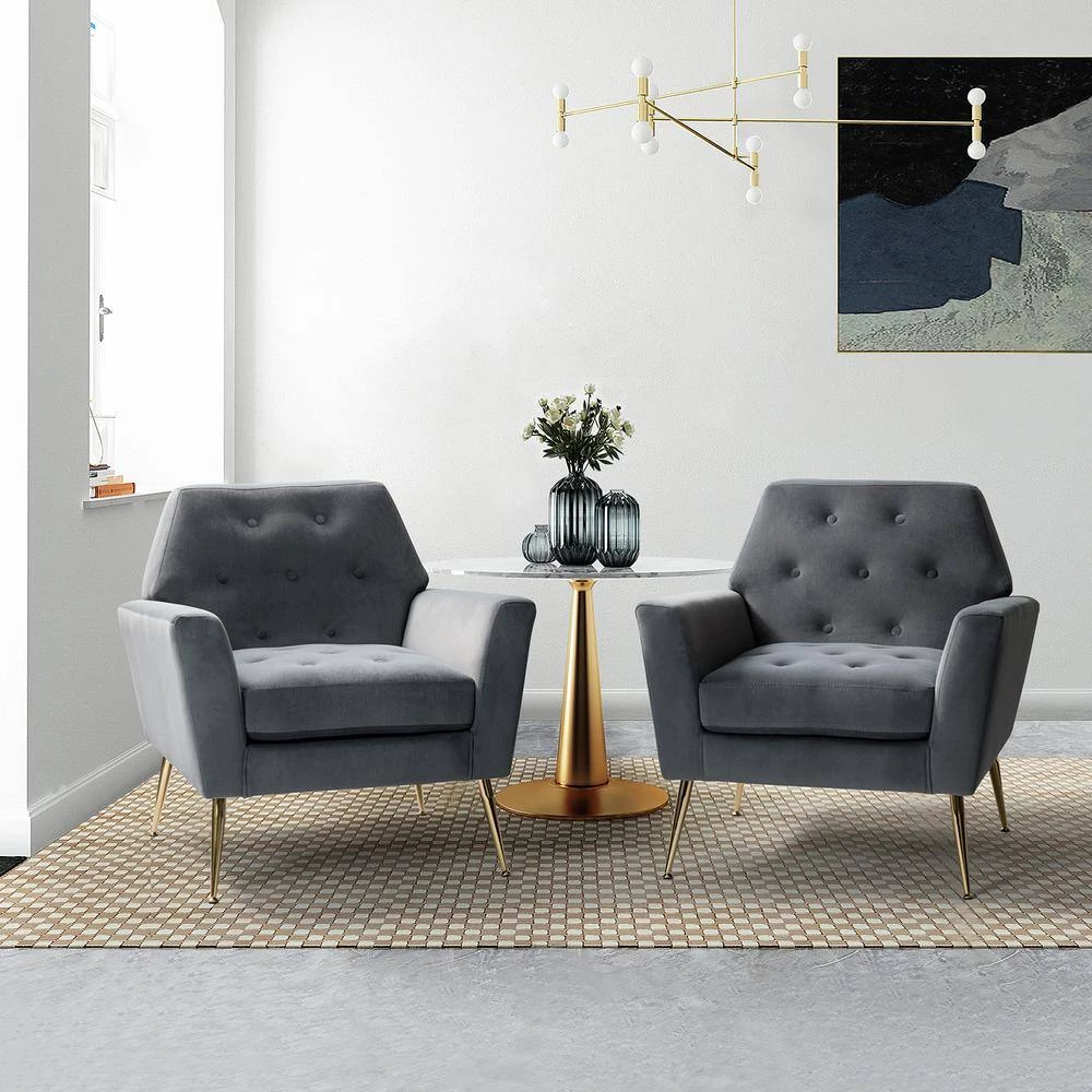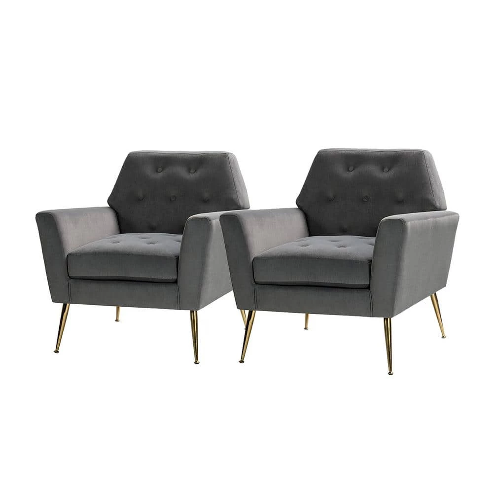 The perfect contemporary-look set to complete your home decor with its vivid color palettes, this attractive solid and manufactured wooden frame armchair set has it all: style, comfort, and durability. With slender polished golden metal legs and unique geometrical-shaped back design, this modern work of art boasts a charming sharp silhouette and showcases an approachable aesthetic while the button-tufted backrest and seatrest adds a touch of elegance to it. Built-in s-spring with medium-density foam filling are upholstered in a skin-touch friendly velvet fabric that gives you a sense of comfort and is suitable for all kinds of living room decoration. Incorporating the modern and classic style perfectly in a gentle appeal, this accent armchair set offers wonderful enjoyment as you curl up with a cup of chamomile or relax with your latest read. It’s the perfect pick for the living room, office room and bedroom.