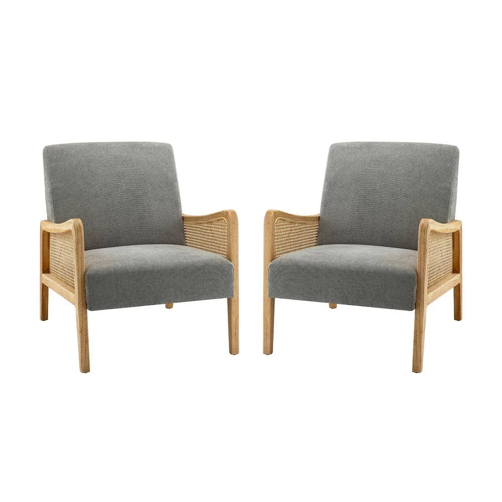 Give your seating arrangement a dash of modern-classic flair with this armchair set. Gathering all the fashion elements in this accent armchair set, it is streamlined, glamorous, and approachable. Four slender legs support its sturdy solid and manufactured wooden frame for reliable weight capacity, while comfortable foam and polyester or polyester blend fabric ensure your superb sitting feeling. Enveloped in soft fabric, this elegant set is such a visual enjoyment that flaunts a unique aesthetic in your decor. Its delicate rattan arms bring classic design and add to the time.ess fashion of this set. With a comfortable seat, this chair set provides an essential spot for sitting and enjoying a good book or catching up on your favorite show, lending an inviting feel to your ensemble.