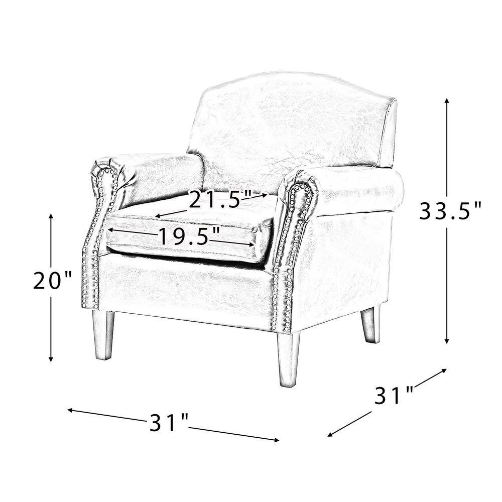 Whether catching your favorite shows after a long day or kicking back with the latest bestseller on your day off, this transitional armchair offers the perfect perching point in your home. Built on a solid and manufactured wood frame with padded foam, it shows a perfect combination of sturdy structure and extreme comfor Luxurious faux leather and compact line design for a cozy space for your leisure time. Chic Nailhead trim rounds out the rolled arms, adding a delicate feeling. This classic armchair with a tasteful camelback is a perfect choice for your living room, bedroom, or any place you want.