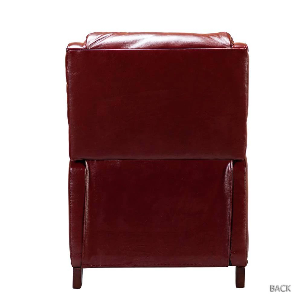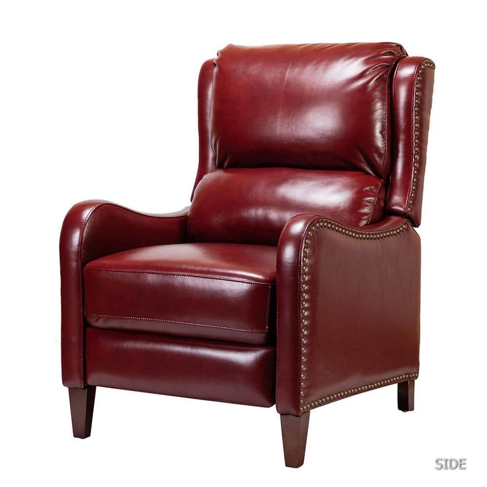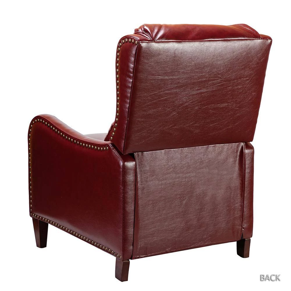 Founded on a solid hardwood frame, a modern take on a classic wing back, this genuine leather cigar recliner boasts accents like thick foam cushioned seat. Upholstered in foam-filled genuine Top-grain leather blend with vegan leather, it sports nailhead trim for an inviting feel. The recliner has an ergonomic design, product engineering, and uncompromising quality. Simply push back to recline to the maximum 140 degrees, no levers or buttons required, then you can really spread out. Comfortable seat and back support for long-term sitting, TV viewing or a relaxed recline.