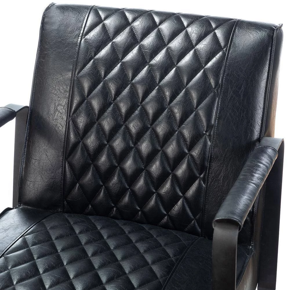 Add sophisticated style and comfort to your home decor with this chair. This handsome tufted accent chair features a leather-like cushioned seat and back for comfort, you can enjoy while you sit back and relax while watching the evening news. Its two armrests are accented with faux leather wrapped for an extra touch of elegant style that is sure to catch the eye of all your guests. Attractive from every angle, this mid-century inspired accent chair is the perfect accent no matter where it stands living room, dining room or office. With its unique color and durable, powder coated black metal frame, this classy chair gives your home decor the wow factor that you have been looking for.