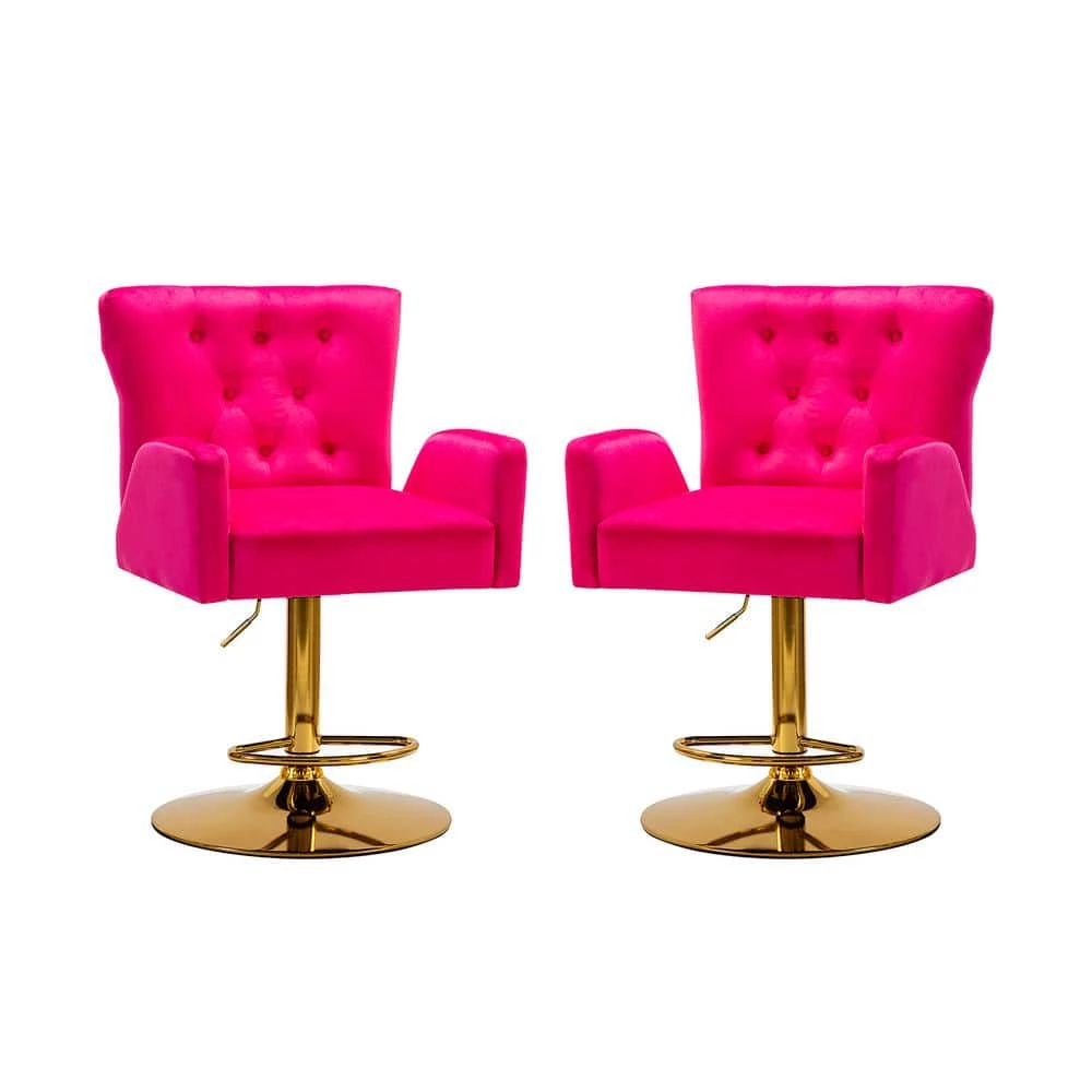 Whether you need a place to sit for eating, working, relaxing or making up, this height-adjustable swivel bar stool set including 2-single stools is the answer. Foam-filled brings a cozy experience while a solid and manufactured wood frame provides superb support. These timeless fashion barstools will not fail to blend with your home decor with their rich color selections. Standing atop a pedestal-style metal base finished in a bright gold hue, its open circular footrest, lever operation tilt, decorative button-dotting tufted back, as well as subtly curved arms brings you unforgettable enjoyment. The humanized design of a plastic ring under the base protects your floor from scratching when you move it to another place. It will be an ideal addition to your kitchen, bar, living room or dining areas, decorate the scenes to the fullest.