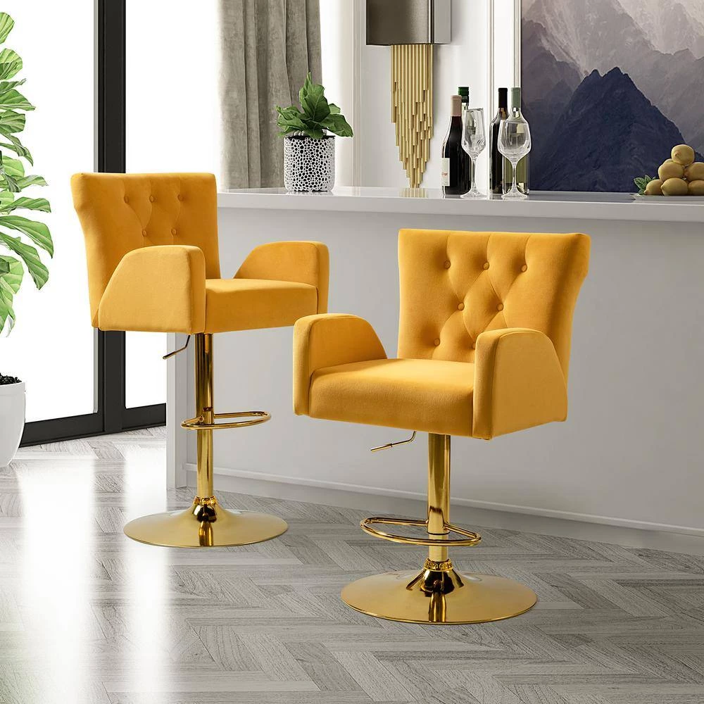 Whether you need a cosy place to sit for eating, working, relaxing or making up, this functional yet stylish bar stool set including two single stools is the answer. Standing atop a pedestal-style metal base finished in a bright gold hue, this sleek addition attracts enough eyeball. Adapt to all styles effortlessly, its solid and manufactured wooden construction wrapped in velvet fabric is filled with foam for permanent comfort with button-dotting tufted full back and subtly carved arms provide you reliable support, adding a dash of distinction. Paired with an open circular footrest and lever operation tilt, this upholstered hight-adjustable swivel bar stool in classic style brings you an enjoyable user experience. The humanized design of plastic ring under the base protects your floor from scratching when you move it to another place. It will be an ideal addition to your kitchen, bar, living room or dining areas, decorate the scenes to the fullest.
