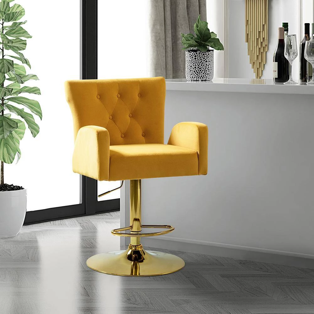 Whether you need a cosy place to sit for eating, working, relaxing or making up, this functional yet stylish bar stool is the answer. Standing atop a pedestal-style metal base finished in a bright gold hue, this sleek addition attracts enough eyeball. Adapt to all styles effortlessly, its solid and manufactured wooden construction wrapped in velvet fabric is filled with foam for permanent comfort with button-dotting tufted full back and subtly carved arms provide you reliable support, adding a dash of distinction. Paired with an open circular footrest and lever operation tilt, this upholstered hight-adjustable swivel bar stool in classic style brings you an enjoyable user experience. The humanized design of plastic ring under the base protects your floor from scratching when you move it to another place. It will be an ideal addition to your kitchen, bar, living room or dining areas, decorate the scenes to the fullest.