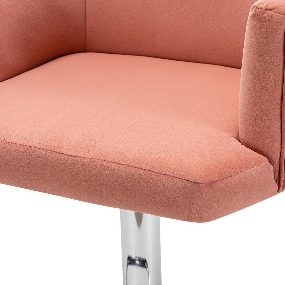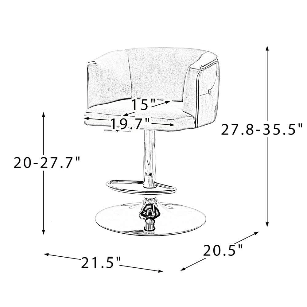 Whether you need a cozy place to sit for eating, working, relaxing or making up, this functional yet stylish bar stool will feed your taste. Standing atop a pedestal-style metal base finished in a bright silver hue, this sleek addition attracts enough eyeball. Adapt to all styles effortlessly, its solid and manufactured wooden construction wrapped in velvet fabric is filled with foam for permanent comfort as the button-dotting tufted barrel-shaped back provides you reliable support, adding a dash of distinction. Paired with an open circular footrest and lever operation tilt, this upholstered height-adjustable swivel bar stool in classic style brings you an enjoyable user experience. The humanized design of rubber ring under the base protects your floor from scratching when you move it to another place. It will be an ideal addition to your kitchen, bar, living room or dining areas, decorate the scenes to the fullest.