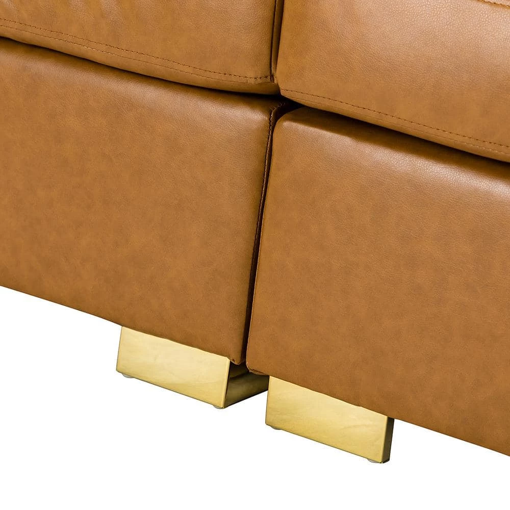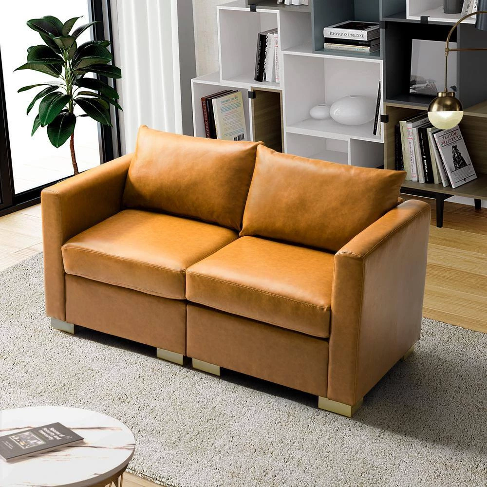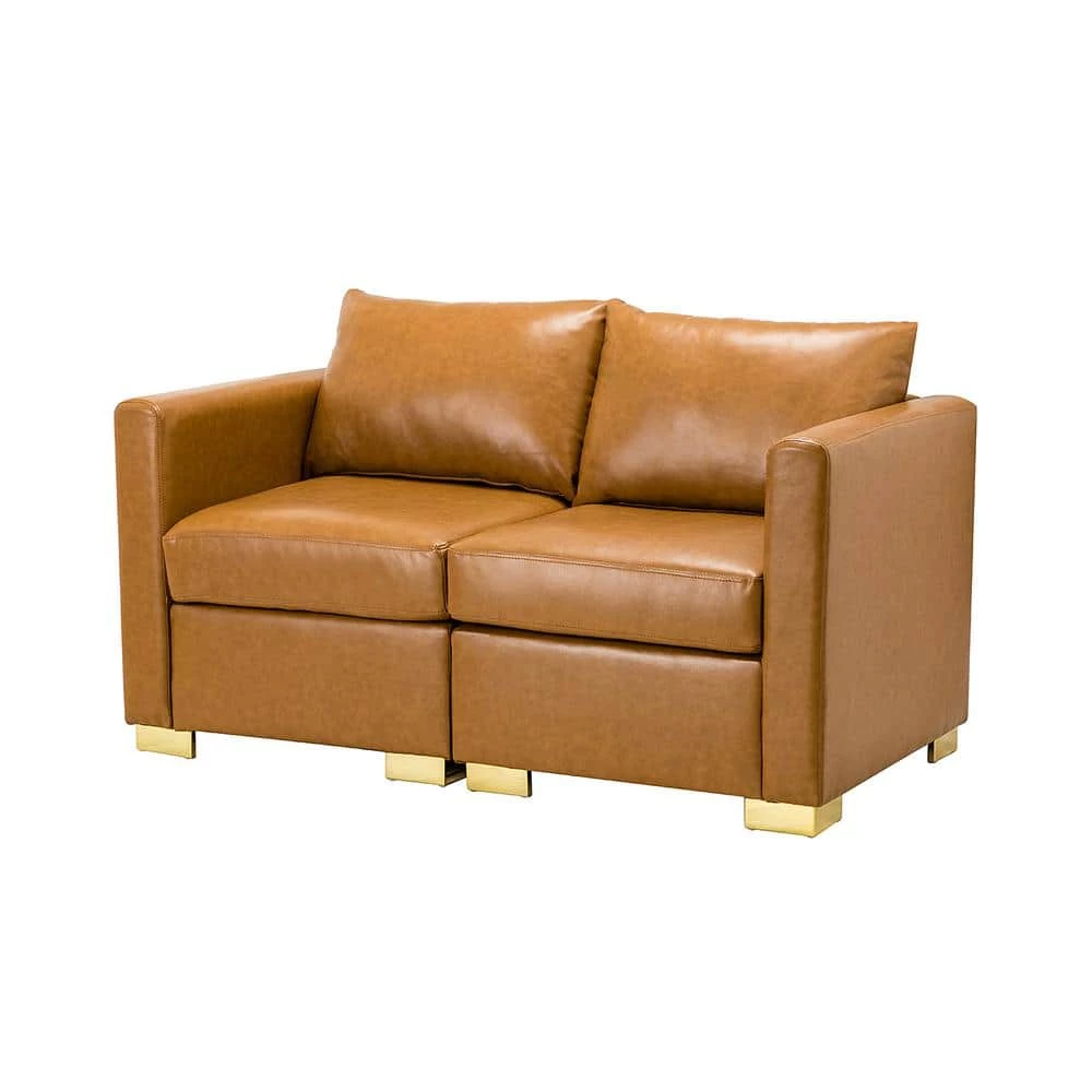 Adding a dash of style to update your home decor. with this approachable modular loveseat. The understated, streamlined solid and manufactured wood frame cooperates with plated metal legs, creating a comfortable spot for you and your loved one to unwind after a day’s work. Its foam-filled seat cushions and polyester fiber-packed back cushions can be removed for easy cleaning and maintenance. Wrapped in luxurious faux leather fabric, friendly to skin touch, this stunning loveseat boasting a hint of contemporary aesthetics is the best pick to show your noble taste. Exceeding all the expectations of a great loveseat, our product checks the boxes of quality, style and incredible value, offering optional solid hues to blend into your living room. bedroom. or other scenes effortlessly.