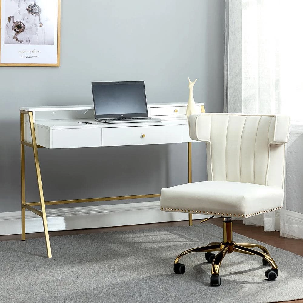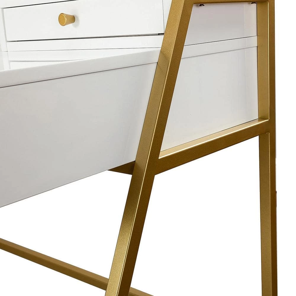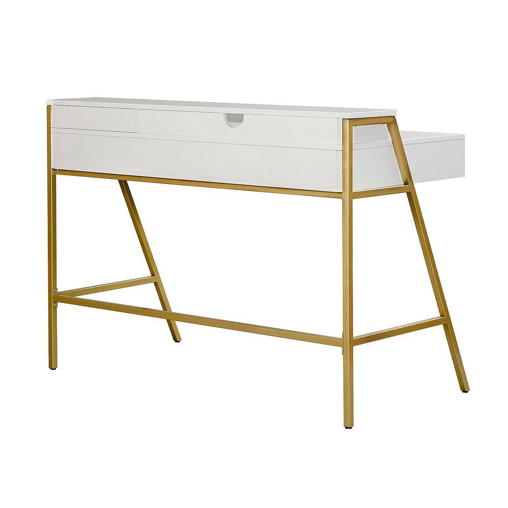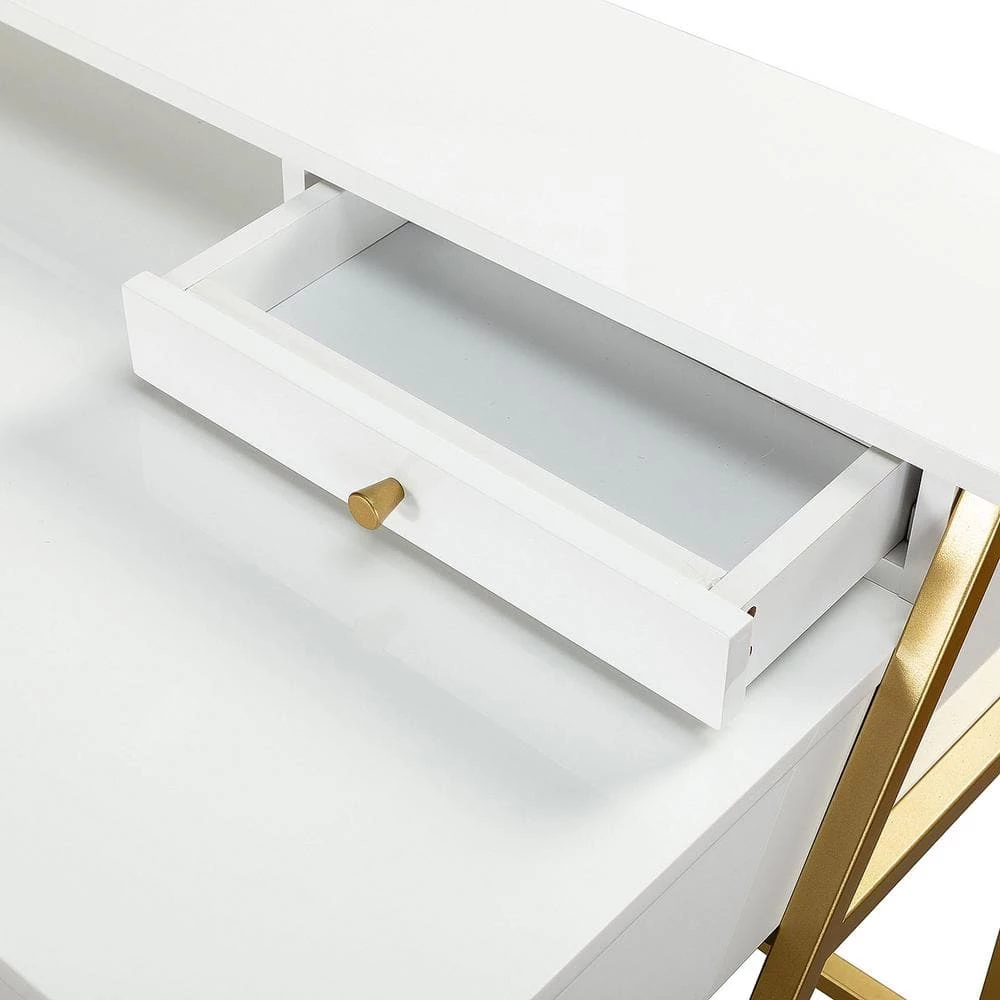 Whether you’re rounding out a dedicated study, or repurposing an unused living room corner, your workspace is defined by your desk. Crafted from stainless steel in a gold finish, this piece is capped with a manufactured wood work surface. The drawer offer plenty of storage space for files, folders, and office supplies, while the polished paint finished desktop provides a perfect platform for your laptop, speakers, and a stylish work lamp.