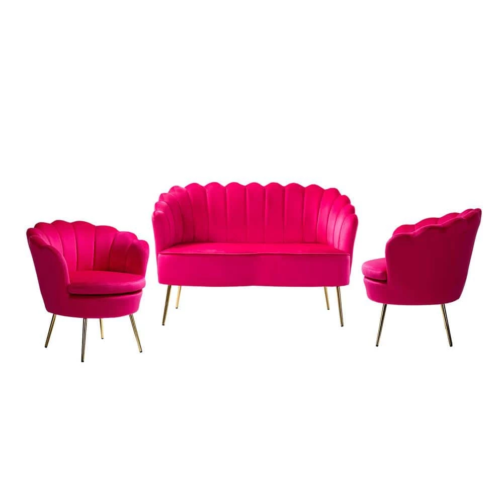 This 3-pieces living room set will provide a fresh and pleasing look to your space and will be the center of attention with tufted design. Including one loveseat and 2-chairs, this set creates an inviting communication space for your guests or family entertainment activities. The medium density foam filling with a sturdy solid and manufactured wooden frame provides comfort and support. Shown in a beautiful velvet upholstered fabric, this set’s sleek lines, comfortable for skin touch, and features an on-trend solid hue that’s bound to blend in with your color scheme. The tufted details decorate the elegant curved flower-shaped back cushions for a dash of distinction while the curved seat of loveseat sofa represents a unique appeal. Contemporary metal legs and a gentle profile lend this set to a serene comfort-perfect addition to your spaces. This cute loveseat sofa set for you and your family members brings the soft and warm enjoyment at home. Simply transform your living room with these statement pieces to add a touch of elegance. This considerate collection will have no problems blending into your home decoration with its natural and modern style and incredible durability. It’s the perfect pick for your living room.