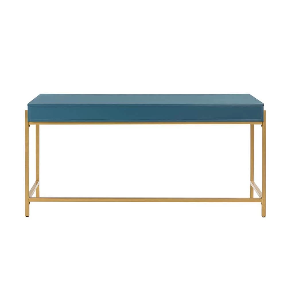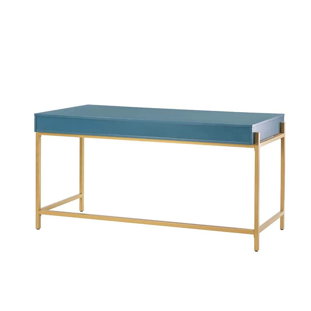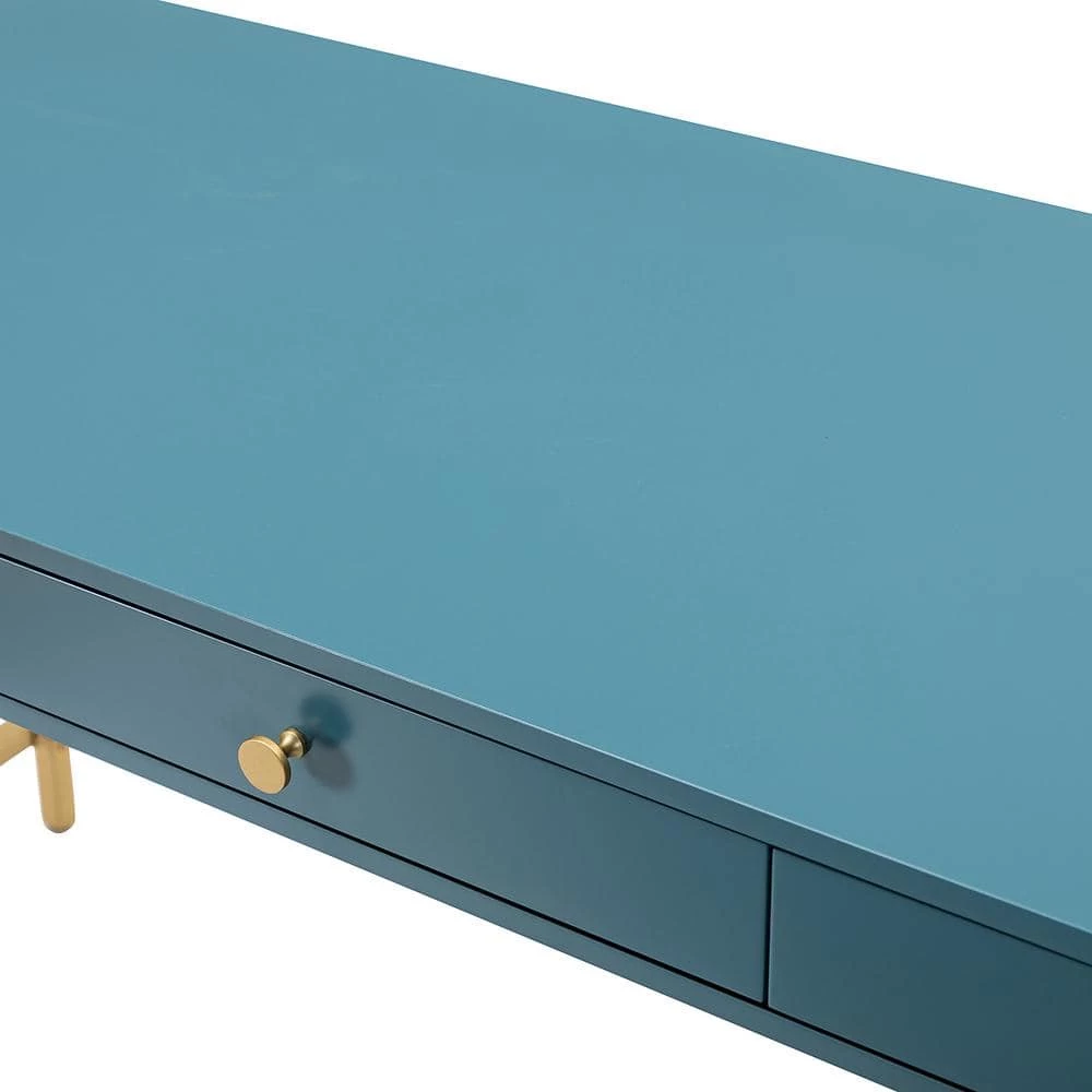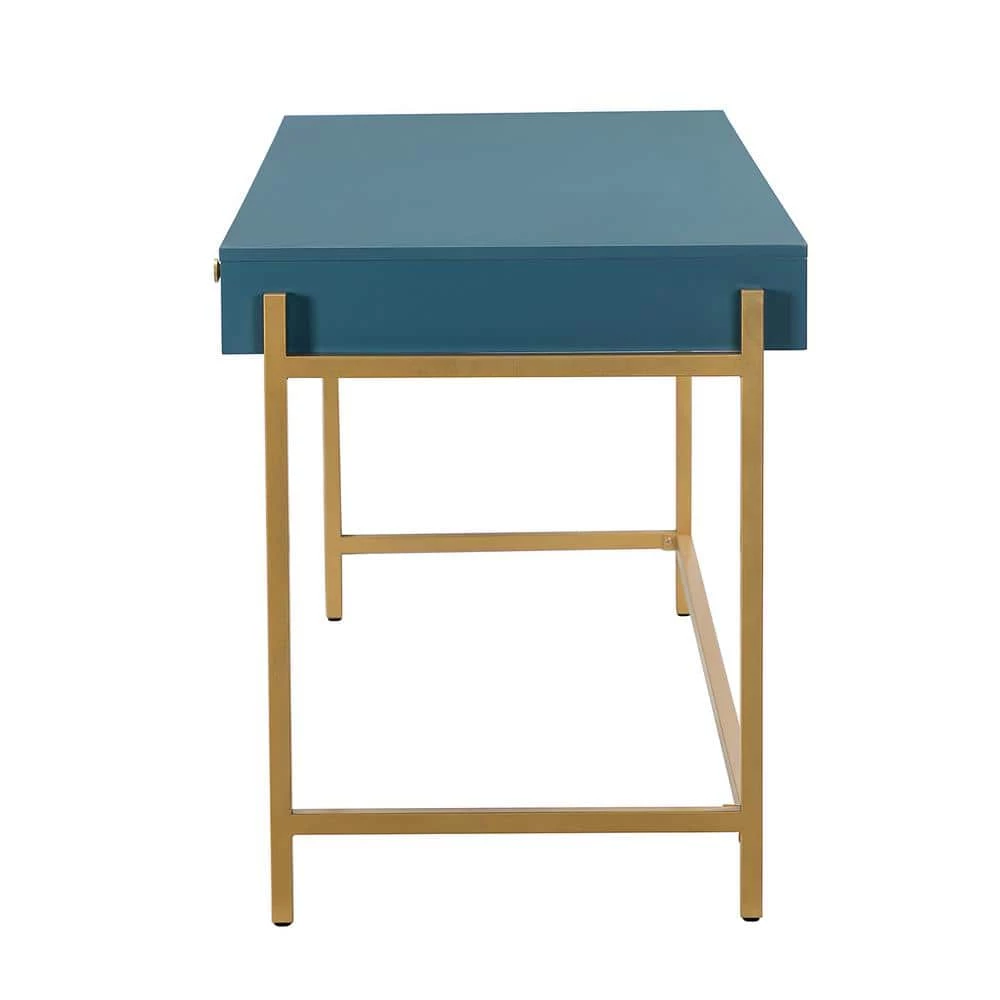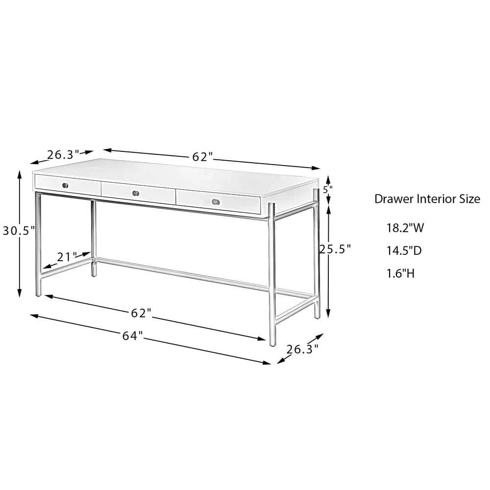Whether you’re rounding out a dedicated study, or repurposing an unused living room corner, your workspace is defined by your desk. Crafted from iron in a gold finish, this piece is capped with a manufactured wood work surface. 3-drawers on roller glides allow you to tuck away office essentials, its generous portions are perfect for clearing away projects and reports. The polished paint finished desktop provides a perfect platform for your laptop, speakers, and a stylish work lamp.